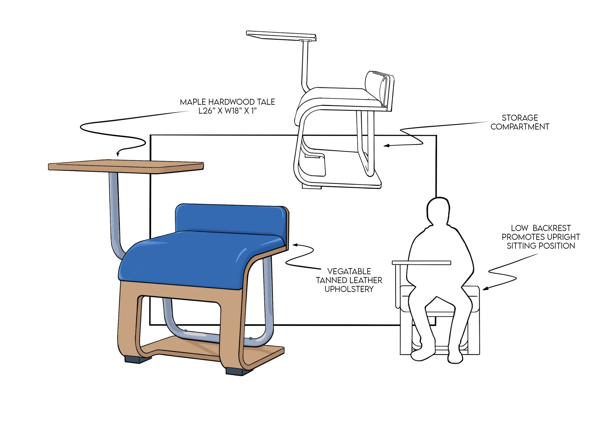 We wanted to focus on productivity of students using the chair, so we minimized the back support, to promote a forward sitting position. This is proven to increase productivity and focus.